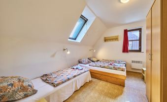 Stárkov 18 km from Náchod: Resort "Stárkov", 450 m a.s.l., semi-detached, built in 1997, renovated, surrounded by meadows. 22 houses in the resort. On the outskirts, in a sunny, elevated position on a slope, along the wooded area, 24 km from the lake, 10 km from the skiing area, in the countryside. For shared use: property 10 ha, meadow, pond, swimming pool (8 x 4 m, depth 150 cm, seasonal availability: 15.Jun. - 16.Sep.). Table tennis, volleyball, badminton, volleyball court, beach volleyball, patio, barbecue, fireplace, children's playground (slide, swing, sandbox). In the complex: reception, lounge, bistro, massage (extra). Billiard table, table football, trampoline, kiosk, storage room for bicycles, laundry (extra). Linen change (suppl. charge extra). Towel change (suppl. charge extra). Room cleaning on request (extra). Bread roll service possible on request. Pre-arrival grocery service. Motor access to 200 m from the house. Public parking. Grocery 1 km, supermarket 8 km, restaurant 1 km, café 10 m, bus stop "Stárkov,mlékárna" 280 m, railway station "Žďár nad Metují" 4.6 km, indoor swimming pool 18 km. Golf course (9 hole) 26 km, sailing school 26 km, tennis 500 m, riding stable, walking paths from the house, cycle lane 10 m, ski lift 6 km, ski school 17 km, cross country ski track 100 m, ice rink 8 km, children's playground 10 m. Nearby attractions: Adršpašsko-teplické skály 15 km, Náchod 17 km, Broumovské stěny 17 km, Ratibořice a Babiččino údolí 22 km, Broumov 24 km, Relaxpark Pec pod Sněžkou 50 km. Well-known ski regions can easily be reached: Radvanice 10 km, Petříkovice 17 km, Mladé Buky 36 km. Well-known lakes can easily be reached: vodní nádrž Rozkoš 26 km. Please note: suitable for families, suitable for seniors baby equipment on request (included). 4-room chalet 100 m2 on 2 levels. Bright, fully renovated, cosy furnishings: living room with Scandinavian wood stove, satellite TV and flat screen. Exit to the terrace. Open kitchen (4 hot plates, oven, dishwasher, toaster, kettle, microwave, freezer, electric coffee machine) with dining table. Bath/WC, sep. WC. Electric heating. Upper floor: 1 room with 2 beds. 1 room with 2 beds. 1 room with 1 double bed. Sep. WC. Terrace 11 m2. Terrace furniture. Beautiful panoramic view of the valley and the countryside. Facilities: iron, children's high chair, baby cot (extra). Internet (WiFi, extra). Please note: suitable for families. Non-smoking house. Maximum 2 pets/ dogs allowed.