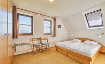 Stárkov 18 km from Náchod: Resort "Stárkov", 450 m a.s.l., semi-detached, built in 1997, surrounded by meadows. 22 houses in the resort. On the outskirts, in a sunny, elevated position on a slope, along the wooded area, 24 km from the lake, 10 km from the skiing area, in the countryside. For shared use: property 10 ha, meadow, pond, swimming pool (8 x 4 m, depth 150 cm, seasonal availability: 15.Jun. - 16.Sep.). Table tennis, volleyball, badminton, volleyball court, beach volleyball, patio, barbecue, fireplace, children's playground (slide, swing, sandbox). In the complex: reception, lounge, bistro, massage (extra). Billiard table, table football, trampoline, kiosk, storage room for bicycles, laundry (extra). Linen change (suppl. charge extra). Towel change (suppl. charge extra). Room cleaning on request (extra). Bread roll service possible on request. Pre-arrival grocery service. Motor access to 200 m from the house. Parking at the house. Grocery 1 km, supermarket 8 km, restaurant 1 km, café 10 m, bus stop "Stárkov,mlékárna" 280 m, railway station "Žďár nad Metují" 4.6 km, indoor swimming pool 18 km. Golf course (9 hole) 26 km, sailing school 26 km, tennis 500 m, riding stable, walking paths from the house, cycle lane 10 m, ski lift 6 km, ski school 17 km, cross country ski track 100 m, ice rink 8 km, children's playground 10 m. Nearby attractions: Adršpašsko-teplické skály 15 km, Náchod 17 km, Broumovské stěny 17 km, Ratibořice a Babiččino údolí 22 km, Broumov 24 km, Relaxpark Pec pod Sněžkou 50 km. Well-known ski regions can easily be reached: Radvanice 10 km, Petříkovice 17 km, Mladé Buky 36 km. Well-known lakes can easily be reached: vodní nádrž Rozkoš 26 km. Please note: suitable for families, suitable for seniors baby equipment on request (included). 4-room chalet 100 m2 on 2 levels. Bright, cosy furnishings: living room with Scandinavian wood stove, satellite TV and flat screen. Exit to the terrace. Open kitchen (4 hot plates, toaster, kettle, microwave, freezer, electric coffee machine) with dining table. Shower/WC, sep. WC. Electric heating. Upper floor: 1 room with 2 beds. 1 room with 2 beds. 1 room with 1 double bed. Terrace 11 m2. Terrace furniture. Beautiful panoramic view of the valley and the countryside. Facilities: iron, children's high chair, baby cot (extra). Internet (WiFi, extra). Please note: suitable for families. Non-smoking house. Maximum 2 pets/ dogs allowed. 754811