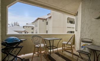With 1,100 square feet, the size is above average for a 2-Bedroom. The condo has lots of windows facing different directions, so you get good natural light and can get a nice cross breeze going if you want fresh air. The living room, dining room, and kitchen are one large space tied together with beautiful hardwood floors. The kitchen is fully equipped with everything you need, features granites counters, stainless steel appliances, and high end cabinetry. It also has a bar that is convenient for keeping your chef company as well as serving up some drinks, apps, or meals. The living room has comfy seating for 6 plus a warm gas fireplace, large HDTV, and views of Ski Resort. The dining room is an alcove off the living room, and also has great views of the surrounding mountains. Off the living room you will find a covered balcony with gas grill and outdoor dining table for 2. This is a great place for your morning coffee or an afternoon refreshment.