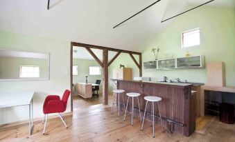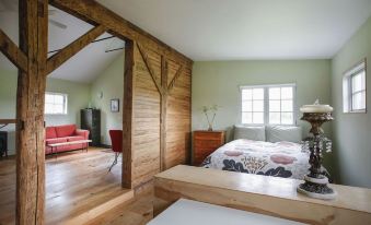 This cozy cottage along with two barns was once part of a working farm. Hand-hewn original oak post and beam construction is exposed; it gives the cottage and its cathedral ceilings, a light drenched airy ambiance. Equipped with a full kitchen, one gets the country rustic atmosphere without forfeiting any modern conveniences. The reclaimed wood siding in the bedroom catches the early morning light reflections of the sunrise. Hand-crafted details abound, the cabinetry, hand-made glass, and photography add accents to the decor.