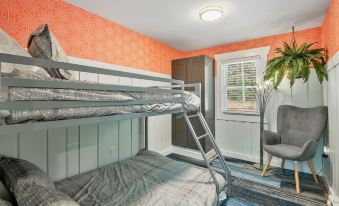 This home offers two comfortable and inviting bedrooms. The primary bedroom features a queen bed, while the secondary bedroom a twin-over-full bunk bed, making it ideal for families with children. We also have a pull-out couch that reveals a queen bed should you need extra space.