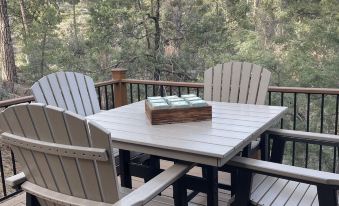 As you can see, this cabin and community are a part of the forest. Please be careful and responsible to protect this cabin, our neighbors and the wildlife. At this time, we do not have an usable outdoor fire pit. Once we can build one that is safe for you and the forest, we will add that. In the meantime, no outdoor fires. in addition, we don’t have a valid fire permit.