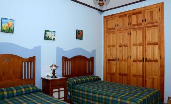 We offer our guests five double rooms, two with a double bed and three with twin beds. We have three bathrooms, a fully equipped kitchen, central heating, living room with a fireplace, terrace, garage and garden with a large pool, surrounded by extensive open areas with fabulous views.