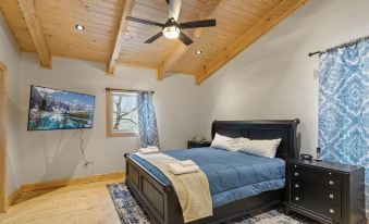 Cozy Rustic Cabin is a newly built three bedroom, two bathroom home. The spacious master bedroom, located on the top floor, has a king bed, smart TV, and attached private ensuite. The ensuite has double vanities and a step-in shower. The main level has two additional bedrooms, both with king beds, that share a full hallway bathroom. The loft game room houses a sleeper chair that converts into a twin-size bed.