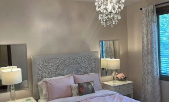 Second bedroom on the main floor also has a sweet touch of boho glam, with carved headboard, faux fur throw and crystal lighting.  Queen bed with cooling memory foam mattress and heated mattress pad, down alternative comforter and pillows. It has a convenient vanity desk.  Walk in closet.  Private bath is right across the hall with a shower-tub.