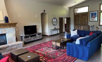 Main floor living room with panoramic mountain views.  Plenty of room for everyone to gather and relax after the day's adventure.  Cozy Fireplace.   Crisp 55in HD TV with high end audio perfect for watching movie or sports.
