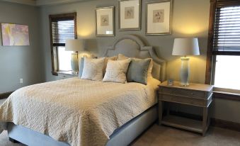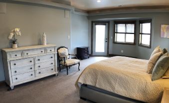 Main floor master bedroom with en suite bath, including jetted soaking tub, provides relaxing retreat.  This bedroom is just steps from the heart of the house, easy to find a few moments of serenity and calm.  It offers a Queen bed with high count linens, walk in closet and dresser.    Direct access to balcony.