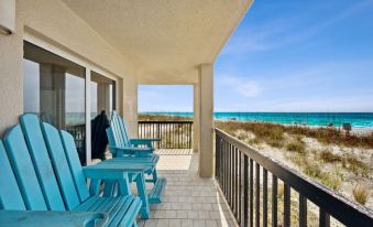 Beach Bliss is a desirable GROUND FLOOR unit in a very PRIVATE GATED COMMUNITY. Exquisite views of the gulf from the living-room and master bedroom and from the wrap-around ''living room'' balcony of this 3 bedroom, 3 bath flat. This unit was completely updated in March of 2023 with updates in every room of the unit. New leather living room reclining sofa and loveseat were added in January 2024. The kitchen features granite countertops and Samsung appliances. It is fully equipped with everything you need to "eat-in" during your stay if you desire. There are three charcoal grills on property for your use as well! All three bathrooms were updated with new vanities and granite in the master bath. The master is also equipped with a new tile walk-in shower.