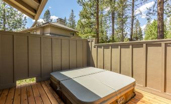 Three bedrooms and two bathrooms are nicely separated for privacy, each bedroom with its own smart flat screen TV. The queen bed plus twin bunk room has access to the back deck, where you can enjoy grilling and dining outside. The king bedroom with en suite bathroom and soaking tub also has deck access, leading out to the enclosed hot tub area where you can enjoy a soak under the stars. A third bedroom is furnished with a king bed.