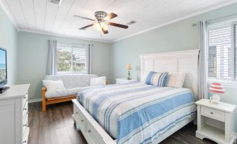 3-minute walk to beautiful Sunset Beach access, this delightful 3-bedroom house offers a soothing escape for guests. Parking for 5 cars onsite. With 1 king bed, 2 queen beds, and 1 futon, there's plenty of space for everyone to unwind (all bed linens, including linens for the futon), bath towels, hand towels, and washcloths are provided at no additional cost. All bedrooms have blackout curtains. The fully stocked kitchen includes essentials like teapot, coffee maker (that can make 1 cup K-cup type or drip coffe pot using paper filters), toaster, blender and large granite counter top for meal prep area. Private front porch and back deck. Enjoy the other amenities like Wi-Fi, 5 (Roku)TV's including one outdoors under house and a washing machine/dryer, making your stay comfortable and convenient. The 2 bathrooms are equipped with a hairdryer, bathtub (primary has bathtub) and shower in each bathroom. Outdoor shower with hot and cold water. Outdoor gas grill for use. Beach chairs, beach buggy to carry items to the beach, beach towels, beach umbrella, boogie boards, pails and shovels. Gas grill available for guest use. 4 beach cruiser bikes you are welcome to use. Make your vacation one for the books with a stay at our place. 10 minute (1/2 mile) to fishing pier and beach stores. About 2 mile walk to Bird Island and the mailbox. Monthly rentals available November, December, January and April.About pets:No pets allowed.About checkOut:Check out before 10:00 AM.About children:Children allowed: ages 0-17.About checkIn:Check in after 4:00 PM.About smoking:Smoking is not permitted.About minBookingAge:Minimum age to rent: 25.About events:No events allowed.