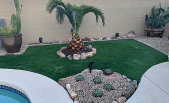 The private backyard of this home features a large heated pool* that is approximately five and 1/2 feet deep surrounded by artificial turf and palm trees, all new pool decking (kool deck), desert cacti, a variety of pool noodles and toys, umbrellas, a bbq gas grill, a large seating area with a couch and two comfortable chairs, a covered patio with a table and chairs for four, a cushioned glider, a pair of movable chairs with new cushions, and a new wall-mounted outside tv. Watch your favorite show, relax by the pool in comfortable recliners, grab a cup of coffee and snuggle on the outside couch, rock in the glider, or play a fun game of cornhole. The pool sparkles, cleaned by a professional pool company and maintained weekly. There are also rubber floats and plenty of quality pool towels for your use. Weather permitting, the temperature of the pool water can be raised for comfortable winter swimming. (Please note that there is NO additional fencing around the pool area, so children must be supervised at all times.)