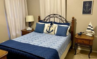 The middle guest bedroom has a new king bed, renovated recently with a new nectar memory foam mattress. There are extra pillows, a chest of drawers, two nightstands, blackout curtains, a ceiling fan, a bedside lamp, and a closet full of games for your enjoyment.