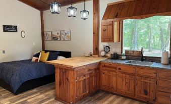 Step inside and breathe. The warm wood interior wraps you in comfort. A plush queen bed is made with soft, upgraded linens. There’s a leather sofa for cuddling up, a smart TV, fast Wi-Fi, and a few classic games for rainy days or unplugged nights. The kitchen is equipped — simple, intuitive, and just right for slow breakfasts and easy dinners.