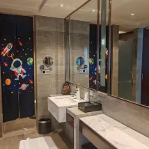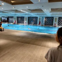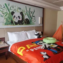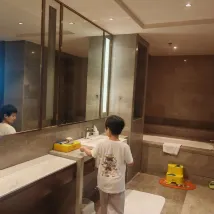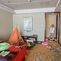 Excellent! Even though the hotel has been open for many years, it's impeccably clean everywhere. They provided a generous welcome fruit platter, not just a couple of token pieces. Right across from the hotel is Pangu Plaza, which is incredibly convenient for dining and shopping. I forgot to take photos of the breakfast, but it was also very good with a wide variety of choices. The pool water was quite clean, but there were swimming lessons with many children, so I only stayed in for a short time. We also received a small gift upon checking out. The best aspect was the flexibility for early check-in and late check-out, which is a fantastic perk not offered by many hotels. They even called ahead to ask about our arrival time and made sure the room was cleaned beforehand, which was incredibly thoughtful. Our family room was great, featuring two sinks and lots of panda plush toys, which our child absolutely adored.