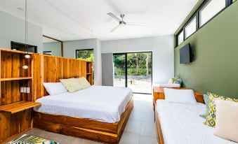 This Villa is a Brand New spacious 2 bedroom 2.5 bathroom Villa, that was designed to entertain large family or friends gatherings. Both bedrooms are the same size and were designed to accommodate a family of four in each bedroom. Each bedroom has a king bed and 2 twin beds and it's own private bathroom with an outdoor shower. This a four bedroom home but with this rental of the two bedrooms you only have access to the 2 interior bedrooms and bathrooms. This house has two exterior bedrooms and bathrooms that will be locked with no access to them. You will not be sharing the home you just dont have access to them. If you want access to all bedroom there is an additional fee. The garage and owners closet are locked and as a guest you dont have access to these areas.