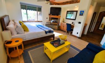 -- Each villa features an electric fireplace, a 55-inch smart TV with complimentary Netflix, a mini-fridge, a king bed with Nectar mattress, and a remote-controlled ceiling fan.