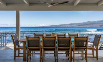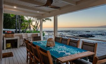 Spacious oceanfront lanai with direct access to the beach and ample seating for relaxing and dining on the large teak dining table and swing sofa.