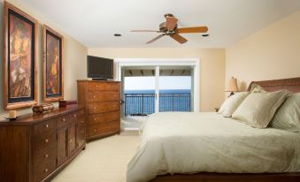 The master bedroom is truly a sight to behold. The Tempur-Pedic king bed opens up to the top floor lanai, which puts a whole new meaning to the phrase, “rise and shine”. During whale watching season, you can lie in bed and hear the whales calling to one another, while watching them breach and splash in the azure waters. With plenty of storage for clothes, a flat-screen TV, and a full master bathroom with dual sinks, a jacuzzi bath and full shower, the master bedroom is the quintessential definition of the lap of luxury.