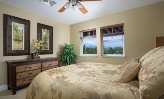 The second level of the house has 2 bedrooms. The "Volcano Room" (so called because it has a view of 4 of the 5 volcanos on our island) is furnished with a queen-sized bed, a large dresser and closet for your storing needs.. A Tempur-Pedic mattress and pillows, rich linens, and an overhead fan help provide you with all of the comfort you could imagine. The upstairs bathroom also includes granite countertops and a high-powered shower to feel fully cleansed after a day at the beach.