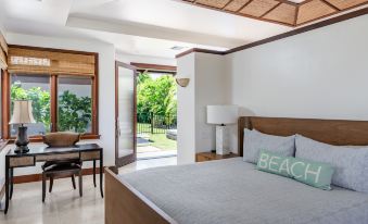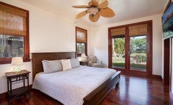 The bedrooms at Beach Walker at Champion Ridge offer comfort and privacy, with each space designed for relaxation. The primary suite is a tranquil retreat. The luxury Ohana suite features a king-sized bed, air conditioning, and direct access to the lanai by the pool and spa. Its ensuite bathroom includes a jetted soaking tub, large walk-in shower, and a private outdoor shower providing a soothing space to unwind after a day in the sun. The second guest bedroom, located in the main house, has a king bed, lanai access, and an ensuite bathroom with garden views. This bedroom is also connected to a spacious office, complete with an additional punee bed, ideal for guest overflow or families with children. For even more privacy, the third and fourth bedrooms—are in an Ohana suite located near the front of the property. The bedrooms feature king-sized beds, air conditioning, and each have a private bathroom, making it an inviting space for additional guests.