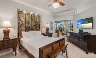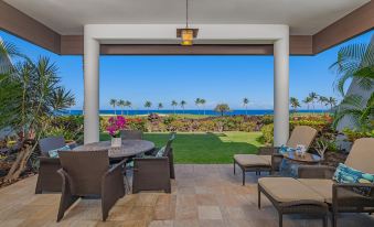 Guests at Mauna Lani Point enjoy world-class amenities, including a newly refurbished pool, jacuzzi, and sauna, along with comfortable seating areas. The entertaining spaces feature BBQs and a fully equipped kitchen, perfect for gatherings. As a guest, you’ll receive a card granting access to The Mauna Lani Beach Club and Napua restaurant, located on a secluded beach cove ideal for swimming and snorkeling.