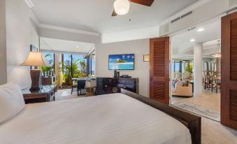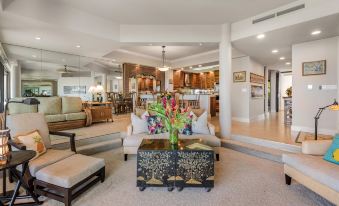 The open-concept living area is designed for both comfort and style, featuring high ceilings, ambient lighting, and tasteful furnishings. The fully equipped gourmet kitchen includes modern appliances alongside granite countertops that enhance the culinary experience. A dining area and spacious living room flow seamlessly into a large private lanai, where guests can enjoy morning coffee or evening sunsets while listening to the soothing sounds of the ocean.