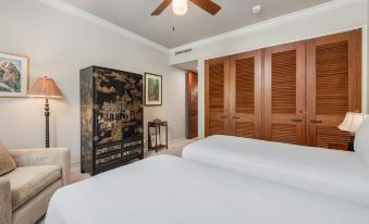 Spanning a spacious layout, the residence features two elegantly appointed bedrooms, each with bathrooms, providing ultimate comfort and privacy for guests. The primary bedroom boasts a queen-sized bed, lanai access, and a lavish bathroom complete with a soaking tub and separate shower. The second bedroom features two twin beds and a serene atmosphere for relaxation.