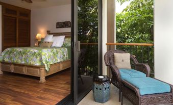 The master suite features a California king bed, fishpond, grounds and ocean views, HD TV with cable, and opens onto the spacious lanai. Adjacent is the large bathroom with dual, granite countertop vanities, walk-in shower and a separate soaking tub.