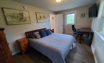 The master bedroom has a queen size bed and a 43-inch 4k smart tv with Roku. It also has and small work area. The second bedroom has a full bed.