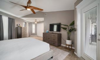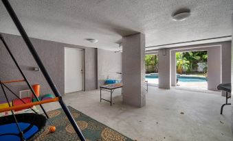 Private, island pool house, perfect for families or guests interested in true indoor-outdoor living. Master has a king bed, guest bedroom 1 has a queen Murphy bed, 2nd guest has a twin over twin bunk bed. Pool, covered outdoor gaming areas and backyard artificial turf. Rooftop terrace. Workout/flex space available downstairs, right off of the pool. Top of the line furnishings. Spa stays at pool temperature.About pets:Pets allowed: dogs (limit 2 total).About checkOut:Check out before 11:00 AM.About children:Children allowed: ages 0-17.About checkIn:Check in after 4:00 PM.About smoking:Smoking allowed: in designated areas.About minBookingAge:Minimum age to rent: 25.About events:No events allowed.