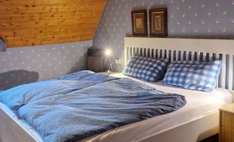"Dachhöhle" (20 m²) with cots and underfloor heating. Here are a total of 3 - 4 sleeps more. A queen bed and a 90 x 200 m bed. However, this room consists of a pitched roof, which does not meet DIN standards.