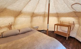 The tents themselves include an airmattress and a single side table. Its a good deal. Its important to note though that the wind in the park can be upwards of 100 kmph which is noisy outside but even noisier inside the tent. So pack with you some noise cancelling ear buds so you can sleep well.