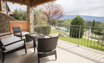 To welcome you, the green of the third oldest golf course in Italy, which you can easily access from the apartment. In front of you, the view opens onto Lake Garda. Around, the mountains and a park with oleanders, cypresses and olive trees that will surround you for the entire stay. And then, spaces to dedicate to wellness with swimming pool and solarium area.