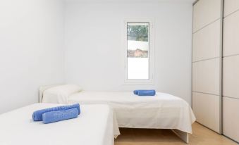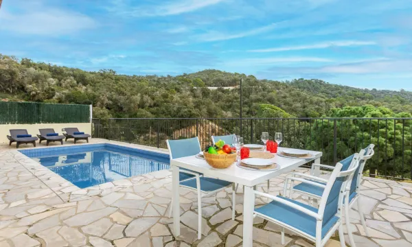 Santa Maria de Llorell 3 km from center Tossa de Mar: Large, modern house "El Moli". In the district of Sta Maria Llorell-ticket 15€, in a quiet position, traffic calmed area, 850 m from the sea, 850 m from the beach. Private: terraced garden, swimming pool angular (6 x 3 m, depth 90 - 180 cm, seasonal availability: 05.Apr. - 10.Nov.) with internal staircase. In the house: air conditioning, washing machine. Stepped path (45 steps) to the house. Single garage at the house at 3 m. Shop 3 km, supermarket 2.5 km, restaurant 1.5 km, bus stop 1 km, railway station "Blanes" 15 km, sandy beach "Santa Maria de Llorell" 850 m. Sports harbour 5 km, golf course (18 hole) 30 km, surf school 5 km, tennis 5 km, cycle lane 200 m. Nearby attractions: Tossa de Mar Castle 3 km, Waterworld 10 km, Marineland 15 km, Jardin Botanico Pinya de Rosa 11 km, Jardin Botanico Marimurtra 12 km. Please note: car recommended. Suitable for families. The owner does not accept any groups. The owner does not accept any youth groups. Neighbourhood highly sensitive to noise. Quietness and good behaviour expected. "El Moli 14", 3-room house 65 m2. Bright, very comfortable and cosy furnishings: living/dining room, window onto the courtyard with open-hearth fireplace (only for decoration), dining table and digital TV. Exit to the terrace, to the swimming pool. 1 double bedroom, north facing position and east facing position with 1 french bed (135 cm, length 190 cm). 1 double bedroom with 2 beds (90 cm, length 190 cm). Open kitchen (dishwasher, 4 ceramic glass hob hotplates, toaster, kettle, microwave, freezer, electric coffee machine). Shower/WC. Air-conditioning, forced-air heating. Heating not available in all rooms. Terrace furniture, barbecue, deck chairs. Beautiful view of the resort. Facilities: washing machine, iron, children's high chair, baby cot for up to 2 year olds, hair dryer. Internet (WiFi, free). Garage space n 12. Please note: suitable for families. TV only ES. To access the Sta Maria Llorell development, you must pay a €15 ticket, which is valid for your entire stay. HUTG-015989