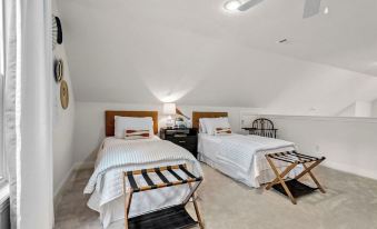 Up the beautiful staircase overlooking the living area you'll find the Loft! The Loft is such a quaint space for the kids to have their own activities or for another couple to have their own privacy. Three plush twin beds with luggage racks, a smart TV for streaming and leather lounge chairs all make up the loft space for you.