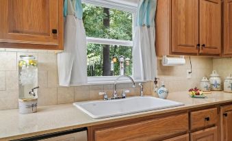 Off of the living room you'll find a dining area comfortably seating 6 people and a fully stocked kitchen with all that you'll need for cooking and baking your favorite meals. Pass through the kitchen and into the sun room which is arguably our favorite room in the entire home! You'll want to spend a lot of your time here, especially in the mornings! It's the perfect place to enjoy watching the birds, squirrels and deer anytime of the year.