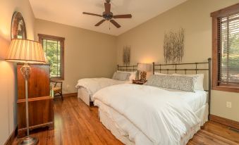 The primary bedroom in Oak Cottage is located off the great room and is complete with a King-sized bed and a second TV. The ensuite primary bathroom is home to dual sinks, a luxurious soaking tub, and a custom-tiled shower. Bedroom 2 boasts 2 Queen-sized beds and another ensuite bathroom with a single sink and large tiled shower.