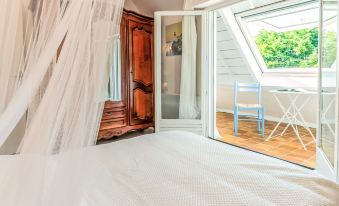 Kersidan: 2-family house "Belle Vue Mer", 2 storeys, detached. In the resort 7 km from the centre of Trégunc, 4 km from the centre of Névez, in a quiet position, from the sea, 250 m from the beach, direct access to the beach. For shared use: property 5'000 m2 (fenced). Private: well-kept garden 300 m2 with lawn and trees, parking on the premises. Shop 4 km, grocery 4 km, supermarket 4 km, shopping centre 15 km, restaurant 3 km, bar 3 km, bakery 4 km, café 3 km, bus stop 7.5 km, sandy beach "Plage de Kersidan" 250 m, thermal baths "Thalasso Concarneau" 16 km. Sports harbour 1 km, marina 15 km, golf course (18 hole) 23 km, surf school 1.1 km, sailing school 11 km, walking paths from the house 50 m. Nearby attractions: Pointe de Trévignon 3.3 km, Port Manec'h 8 km, Pont-Aven, Ville de Peintres 11 km, Concarneau, Ville Close 15 km, Quimper 40 km. Hiking paths: GR34, sentier des Douaniers 200 m. On the estate animal husbandry. Please note: the owner lives in the same residence. "Belle Vue Mer", 3-room apartment 58 m2 on 1st floor. Bright, with sloping ceilings, beautiful and romantic furnishings: upper floor: living room with sloping ceilings. Exit to the balcony. 1 room with 1 french bed (140 cm, length 190 cm). Exit to the balcony. 1 room with sloping ceilings with 2 beds (90 cm, length 190 cm). Exit to the balcony. With sloping ceilings, open kitchen (oven, dishwasher, 4 induction hot plates, toaster, kettle, freezer, electric coffee machine, Capsules for coffee machine (Senseo) extra) with dining table. Bathroom, sep. WC. Electric heating. 3 small balconies 3 m2, south facing position. Balcony furniture. Very beautiful panoramic view of the sea. Facilities: washing machine, iron, hair dryer. Internet (WiFi, free). Please note: non-smokers only. Smoke alarm. Offer by a private individual according to Art. 155, IV of CGI.
