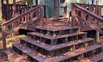 When you step out onto the side porch, there is a large table with six chairs under a roof, still a nice spot if it's a rainy day! The deck wraps around the back, uncovered. More chairs are here for additional seating. Theree is a gas grill for your use. You will see the backyard is large and beautiful! There's a fire ring in the yard that you are free to use. There is also a deck that wraps from the front of the house around one side with some additional seating. When out back you will see and hear the birds singing and hear the sound of the West Canada that runs below at the back of the property! We have seen heron fishing in the creek and occasionally bald eagles flying nearby.