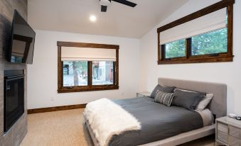 Master bedroom: Features a queen-sized memory foam mattress and ensuite bathroom with dual vanity and large standing bathtub. Feel free to start the fire and turn on Netflix!