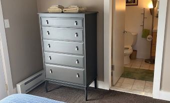 Down a spiral staircase, is the 3rd bedroom which also doubles as a game room. There is a twin bunkbed, a small futon and a few beanbag chairs for lounging. The one and only TV plays a small selection of DVD's and Wii games, so not completely unplugged! There is a small basket of kids toys and figurines as well as a dartboard.