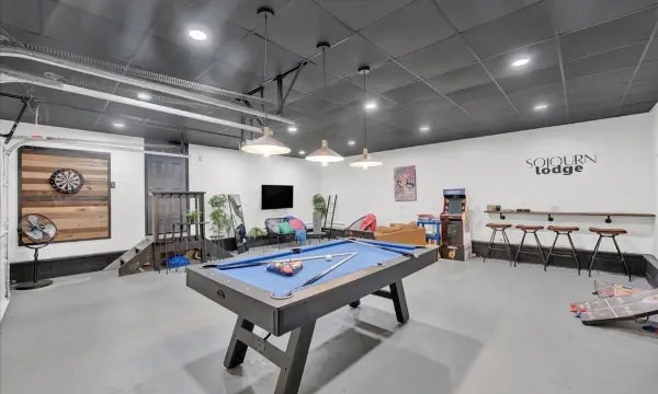 GAME ROOM- Step into the game room, a haven for endless entertainment featuring a pool table, dartboard, comfortable sitting area, an array of board games, and even a classic Pac-Man arcade machine, promising hours of fun for all ages.