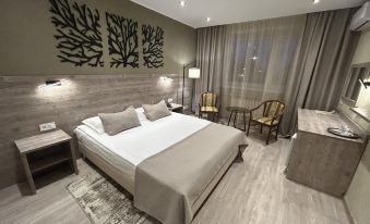 Бронировали отель в августе 2023 года на 2 ночи, номер комфорт, по тарифу выходного дня. Внешне, здание имеет непривлекательный удручающий вид, территория с разбитой старой плиткой и почти отсутствием красиво оформленного озеленения и цветов. Войдя внутрь отеля, были приятно удивлены великолепным интерьером холла. В номере красивая новая мебель, подсветка потолка, картин, много бра и зеркал, удобная постель с белоснежным бельём. Комната светлая, чистая, вся необходимая техника (кондиционер, сейф, холодильник, фен) и посуда в наличии и в рабочем состоянии. В ванной комнате отличный тропический душ, мягкая вода. Огорчило при заселении отсутствие второго халата, набора полотенец и малое количество косметических средств( в наличии было 2 зубные щётки, 2 пакетика геля и 2 пакетика шампуня на 2 дня, для 2 человек).Халат и полотенца, по нашей просьбе, нам принесли, а вопрос с моющими средствами был решён благодаря личному дорожному набору. Меню в ресторане на завтрак "Шведский стол" не отличается разнообразием, отсутствуют сосиски, нет выпечки, только 2 вида печенья, в то же время голодным никто при желании не останется. Имеются на выбор: 2 вида каш, омлет, отварное яйцо, творожная запеканка, салаты, картофель, макароны, тефтели, котлеты, сок, компот, чай, кофе. Интерьер ресторана нам понравился, но обслуживание в первое наше посещение почти отсутствовало в зале. В целом мы довольны выбором отеля-огромное, по сегодняшним меркам, внутреннее пространство, просторные коридоры и лестницы. В отеле тихо, уютно и спокойно. Расположение отеля в центре города, всё в шаговой доступности, рядом набережная и Владимирский парк. Персонал доброжелательный и компетентный во всех вопросах. Спасибо! Рекомендуем!