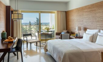 Facing the swimming pools, air-conditioned rooms and suites feature a modern design and are equipped with a flat-screen TV, a mini-bar and a coffee machine. Bathrooms are open-plan with walk-in shower, bath, hairdryer, slippers, robes and luxury amenities.