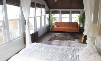 4. The beautiful back porch bedroom, also known as the "Treehouse" has panorama window-walls on 3 sides overlooking the backyard. This room has both a queen bed and a futon that can be made up by request. This room is seasonal, as it's separated from the HVAC system and is colder in the winter and warmer in the summer than the other rooms. But if you prefer particularly cool or warm sleeping, this is where you’ll want to sleep depending on the season!