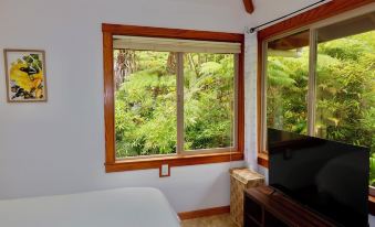 Bedroom Sanctuary: The bedroom is a personal haven with a comfortable queen-size bed, skylights for stargazing from the comfort of indoors, and large windows that let the natural beauty of the rainforest become part of your indoor space.