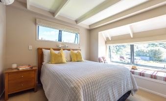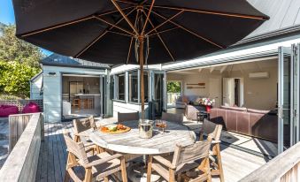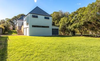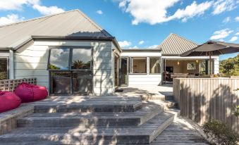Onetangi Beach Pavilion is the ideal family beach house, located just metres from the golden sands of Onetangi beach. A sunny house with a large living area, a deck with sea views, and a huge lawn for ball games, there is plenty of room for kids and adults alike to have fun here.