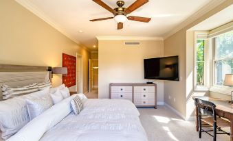 Master: The Upstairs Master Bedroom contains a large King Size Bed with custom bedding and high-end linens, a 55′ HDTV, a separate desk area, and luxurious bathroom complete with a large shower and vanity.