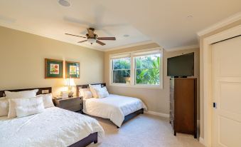 Bedroom 2: Bedroom 2 contains contains a Queen Size Bed with custom bedding and high-end linens, a 55′ HDTV, and luxurious bathroom complete with a large soaking tub, custom marble shower, and lanai access