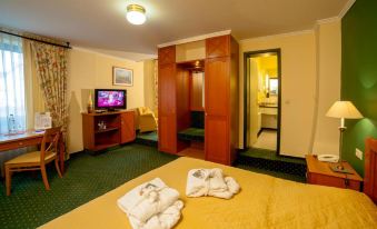 Mooie, ruime kamer. Spijtig dat er geen airco was. Ontbijt: voldoende. Avondeten: degelijk (half pension: weinig keuze). We hadden een spedciaal pakket doch aan de receptie wist men niet goed wat allemaal inbegrepen was (een medewerkstter deed nogal moeilijk). We wilden na drie dagen hetzelfde pakket verlengen aan de receptie doch dit ging niet. Dan maar een nieuwe boeking gemaakt via internet (goedkoper dan prijs aan receptie). Personeel heel vriendelijk behalve een dame aan de receptie.